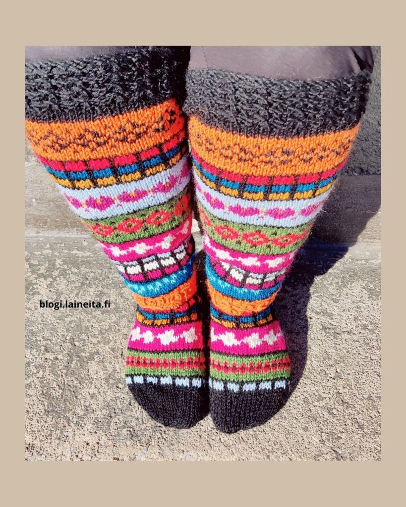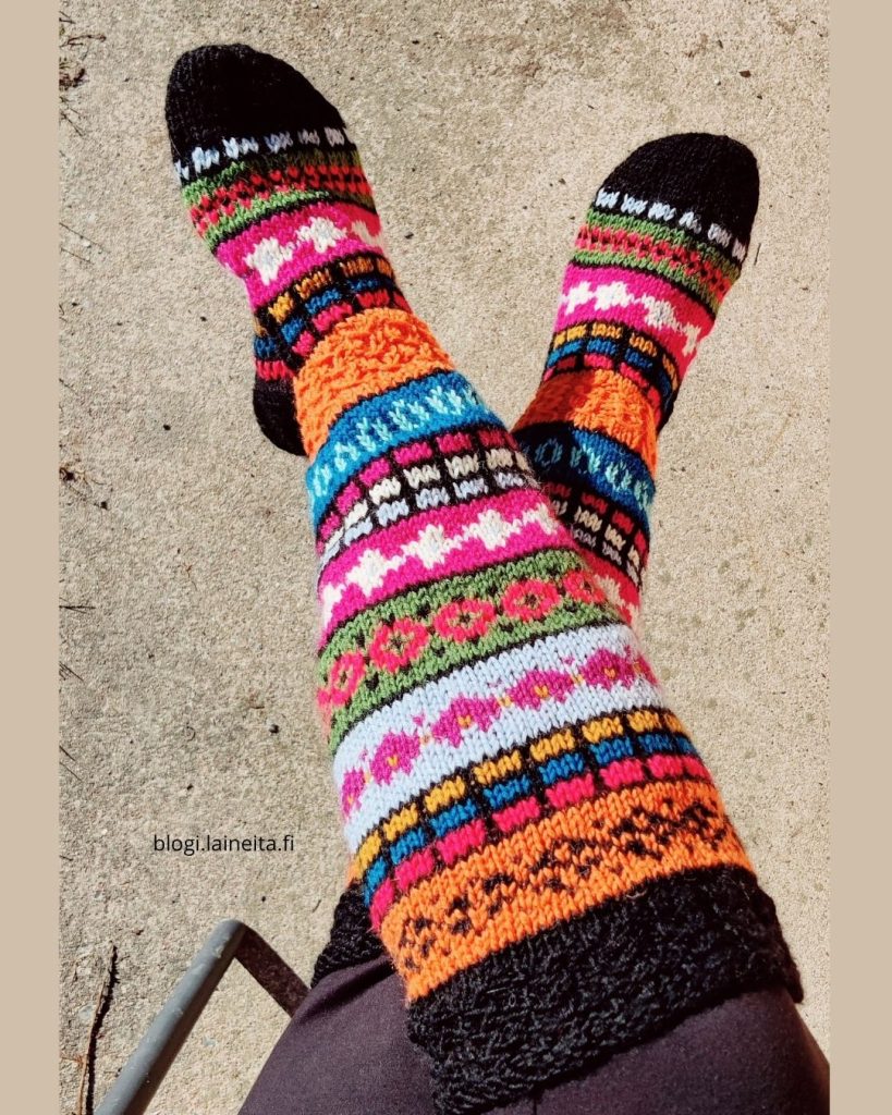 Väri-iloa kerrakseen! 🙂 Näistä piti alunperin tulla aikuiselle tyttärelleni sukat (olen hänelle jo aikaisemminkin tehnyt kolmet polvipituiset kirjoneulesukat), mutta kun näytin näitä keskeneräisenä, niin hän sanoi, että ovat ehkä vähän liian värikkäät hänen makuunsa. Teinkin nämä sitten itselleni. Nämä Villit Fridat ovat Sinikka Nissin suunnittelemat ja niiden ohje löytyy hänen SiniSukat -kirjastaan. Ohjeen koko on 38-39. Jätin jalkaterän kuvioista 8 kerrosta pois, niin sain itselleni sopivan kokoiset.