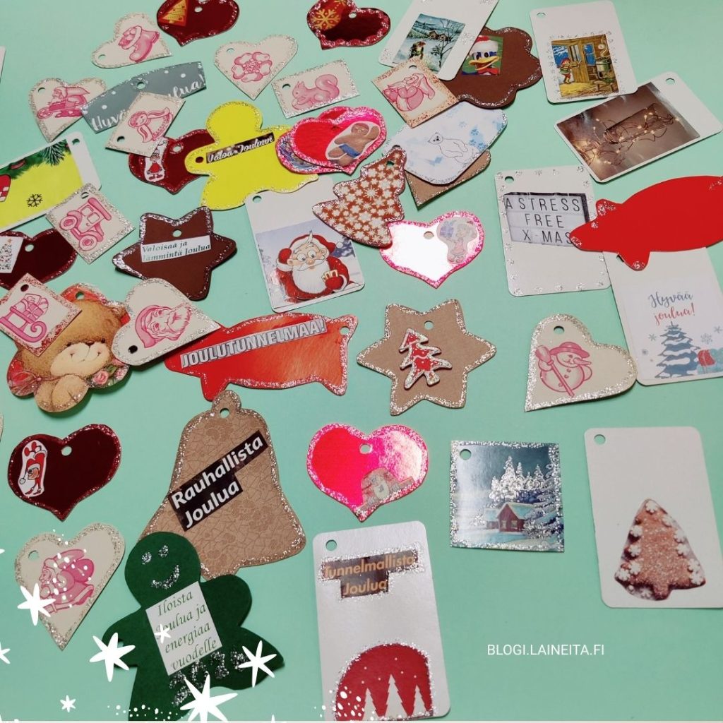 Osan tein piparimuoteilla kartonkiin piirtäen ja siitä leikaten, osan neliskulmaisiin pikkukortteihin. Vanhasta vihon kannesta leikkasin tuon nallen ja vanhasta joulukalenterin pohjasta sai myös kivoja kuvia. Lehdistä ja mainoksista olen jo aikaisemmin kerännyt tätä varten valmiiksi jouluisia kuvia ja tekstejä. Rei’ittimellä tein kortteihin reiät lahjanarua varten, lisäksi koristelin kortteja kimalleliimalla.